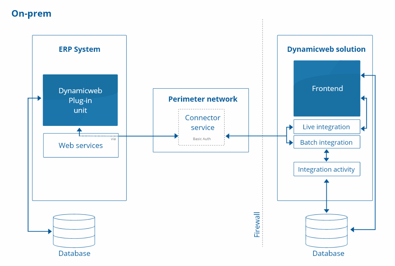 A data integration between Dynamicweb and an on-prem ERP system is established by communicating with a web service that exposes data from the ERP database. There are three main components to an on prem data integration: