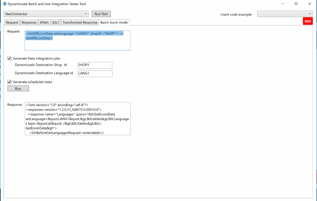 - In the Request field write the GetAllEcomData request with an appriopriate language and shop id – e.g. <GetAllEcomData setlanguage="LANG1" shopID="SHOP1"></GetAllEcomData>