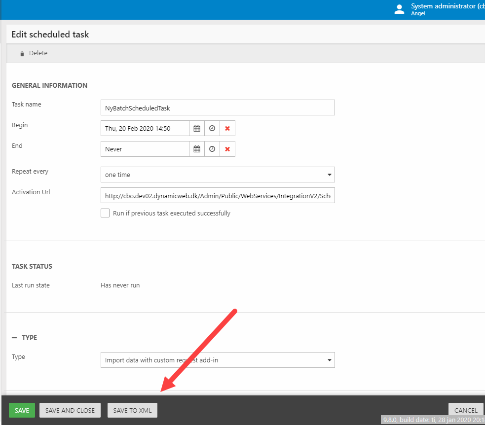 As of DW 9.8, scheduled tasks may be saved as XML-files by clicking Save to XML in the save-bar (Figure 2.3). They are then placed in /Files/Integration/ScheduledTasks and may be placed under source control & deployed - see section on config files for more deployment-related goodness.