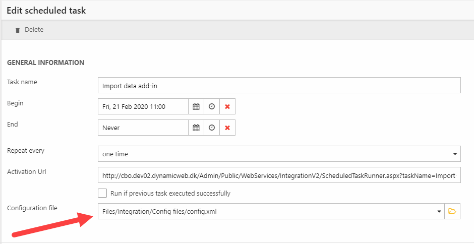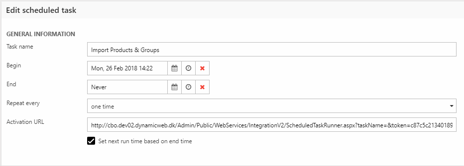 Under the integration area, scheduled task add-ins typically connect to a remote system and submits a request for data, then receives a response and saves it to disk. Each add-in comes with a set of parameters which are required by the remote system and/or Dynamicweb.