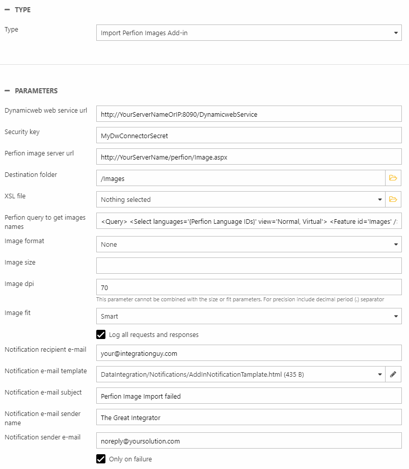 The notification parameters are used to send a notification email to one or more email addresses whenever the batch job is run – you can use the Only on failure setting to only send an email if the job fails.