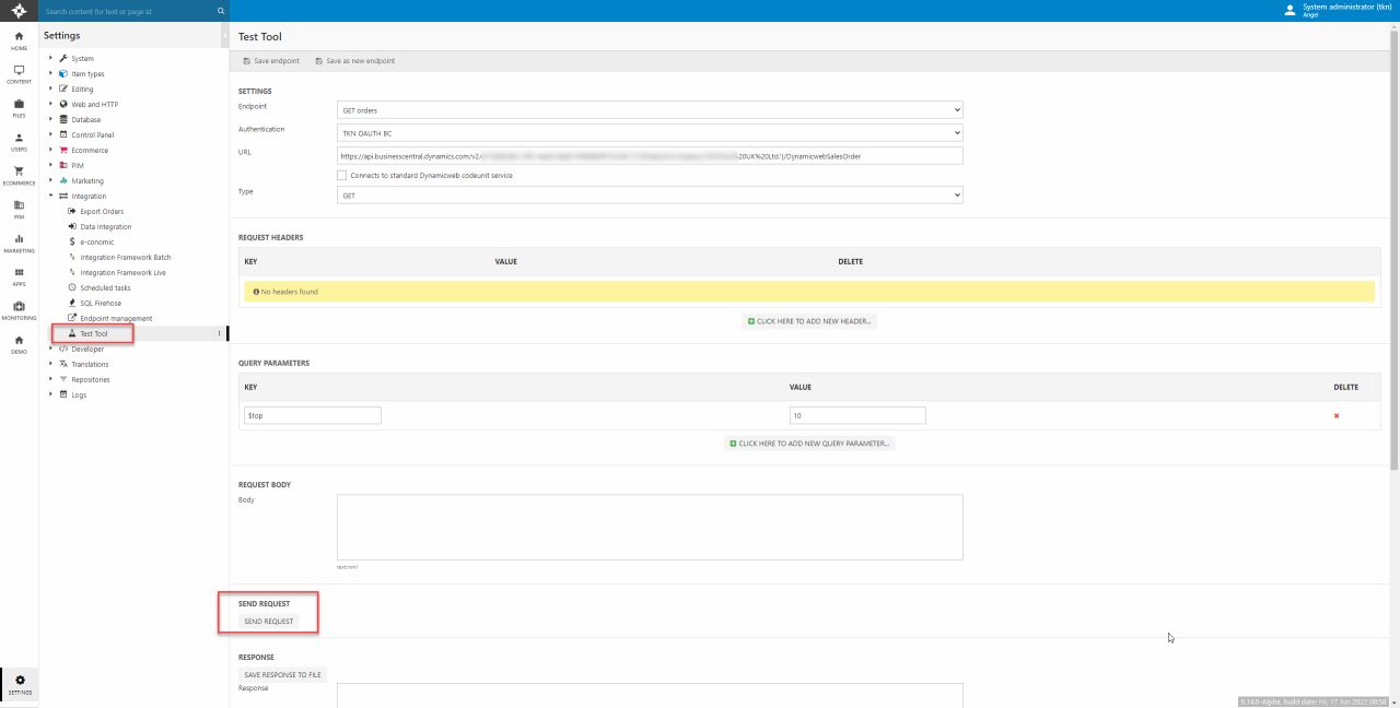 The internal Test Tool of Dynamicweb contains functionality for testing requests to and responses from an endpoint – in a manner reminiscent of Postman and similar tools.
