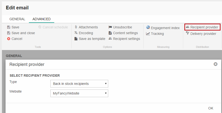 - Go to the Advanced tab, open the recipient provider settings and select the back in stock recipients provider and the website (Figure 5.1).