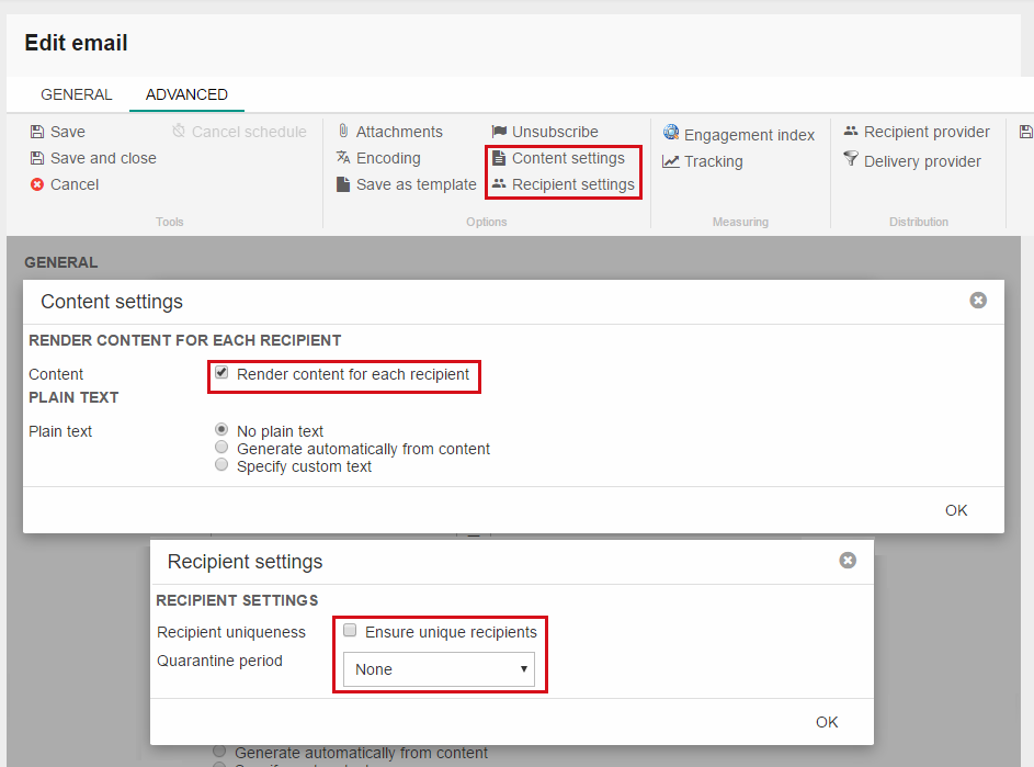 Next, open the contents settings and check render content for each recipient to make sure the product(s) back in stock are correctly rendered for each recipient, and the recipient settings and uncheck Ensure unique recipients to allow users to receive more than one notification email from you (Figure 5.2). Don’t set a quarantine period.