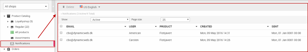 Your customers can now add themselves to the Notifications-list, which is accessible from the Notifications-node in your backend product catalog.