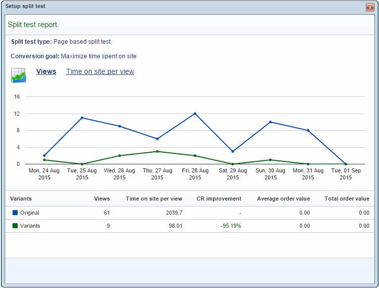- You then have a graph of the data collected during the split test. The data you can see will depend on the conversion goal. In the screenshot above, the goal is to maximize the time spent on your site, and consequently you can see the maximum time on site per view per variant.