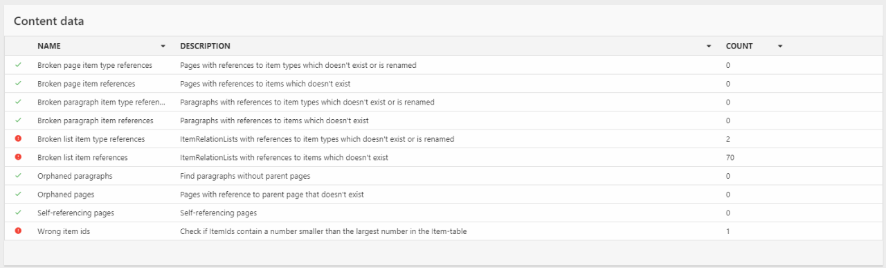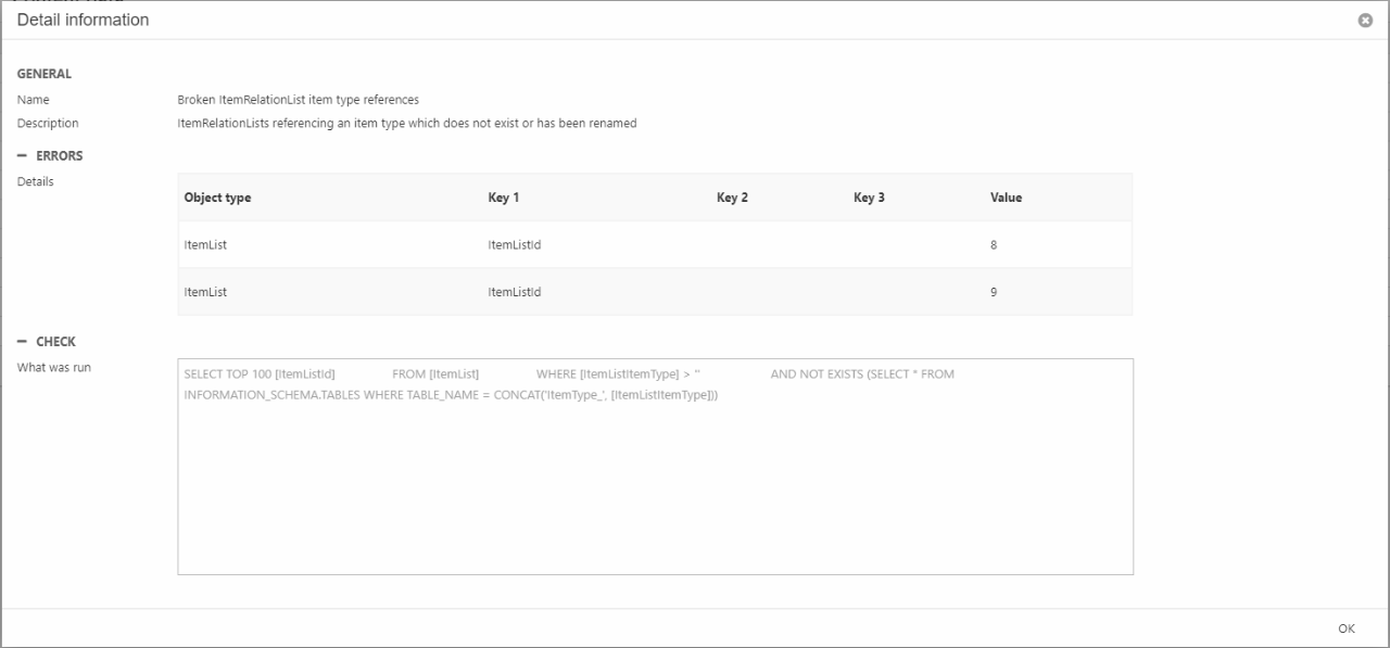 - A list of issues found – in this case two instances of an item relation list which reference an item type that no longer exists