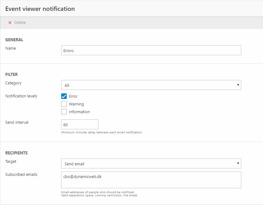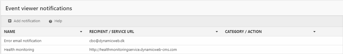 Event viewer notifications are emails which are sent to key people when a certain system event occurs. The notifications can be configured quite extensively, which makes it possible to set up notifications for key parts of the solution separately, and with varying degrees of urgency.