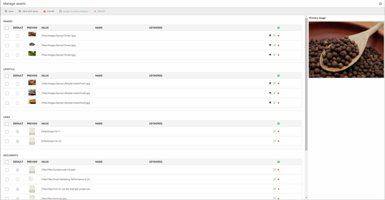 • Use asset categories to group assets – images and files – and control how they are inherited to variants and language versions on a category by category basis