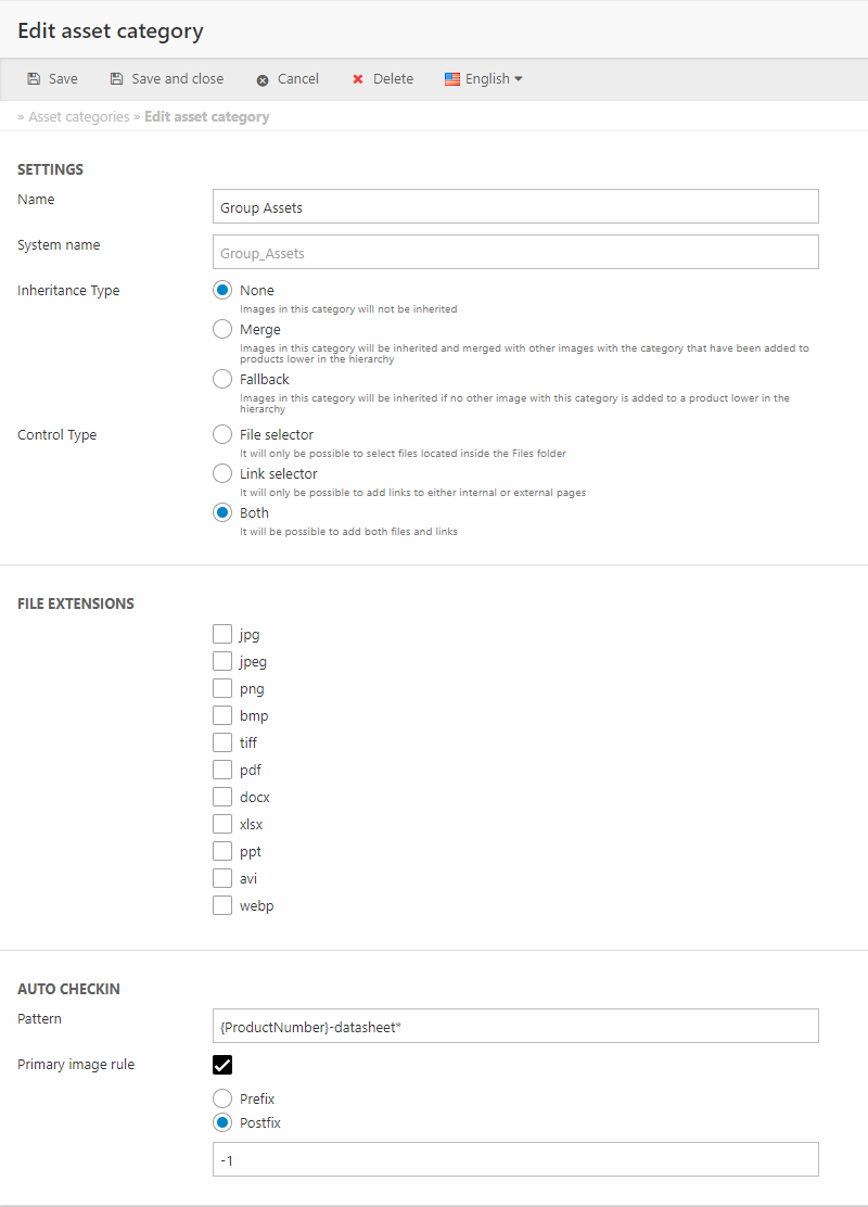 • Merge means that assets are inherited from the main product to variants/language versions and merged with assets added specifically to the category on the variant or language version