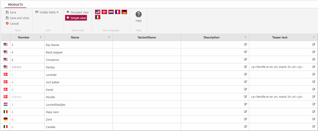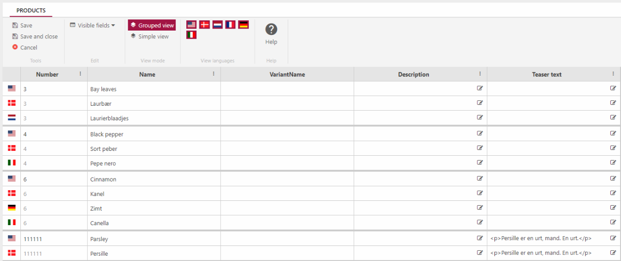 Your grid edit view could then look something like Figure 1.1 – 4 different products are shown, grouped with their language version and the selected fields – Description and Teaser text – shown next to the obligatory colums Number, Name & VariantName.