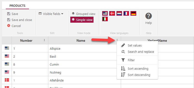 The Grid Edit view is a tool which allows you to edit multiple products, language versions, and variants in an excel-like grid with access to bulk-edit like operations on columns, like Search and Replace and Set Values. Changes made in this view are only saved when you click Save or Save and close.