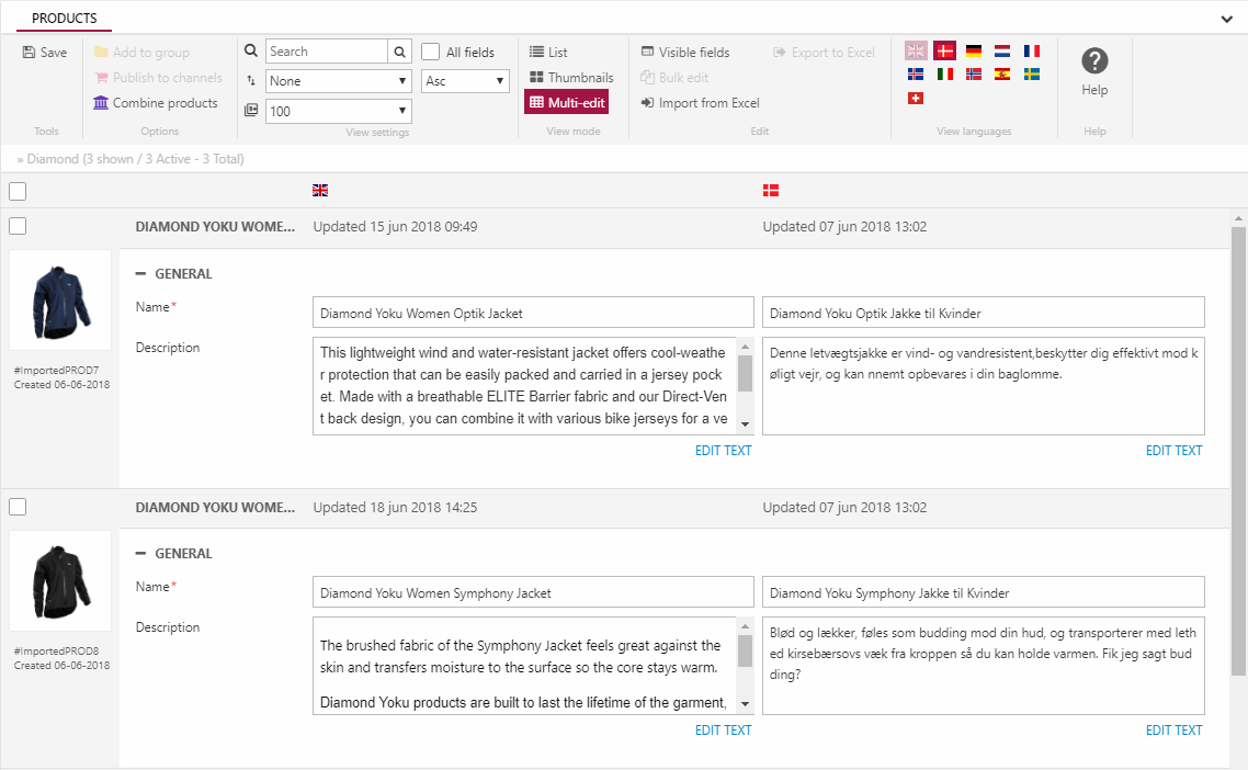The Multi-edit view mode is optimized for editing products. In this mode, the fields and language selected are rendered and can be edited directly from the list - in this screenshot, the Name and Description fields are selected for two languages (Figure 4.1).
