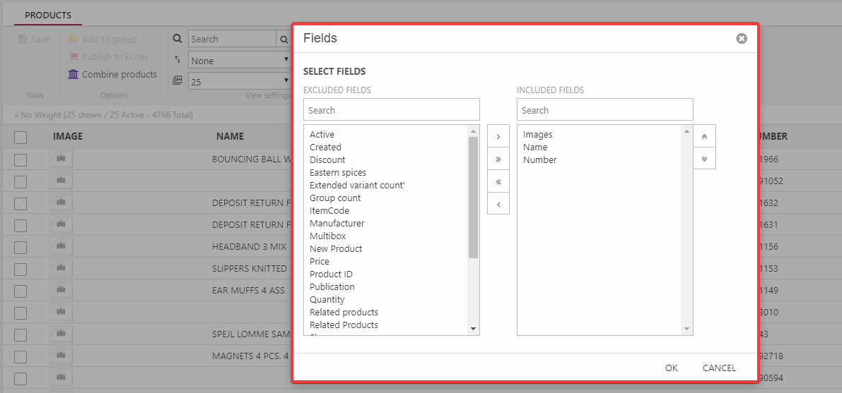 • Move the field you want to include from the left side column to the right side column