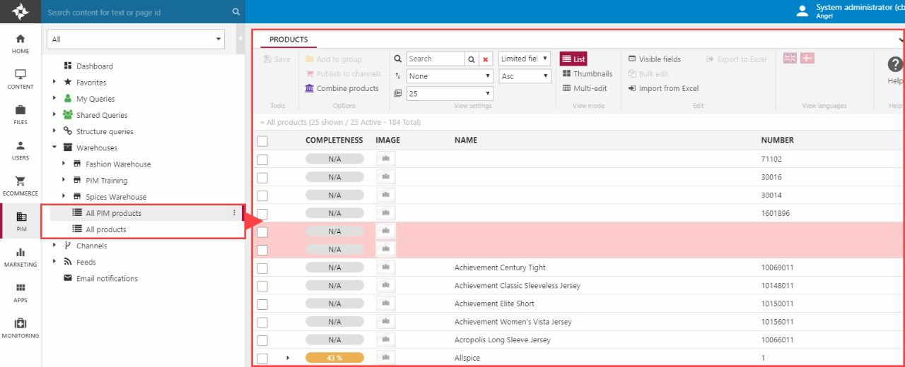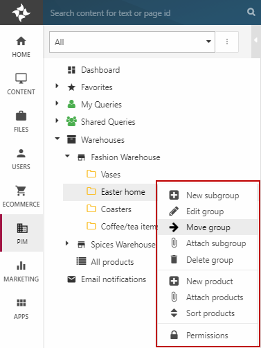 Two special product list nodes – All products and All PIM products – exist outside of the regular warehouse group structure (Figure 5.1).