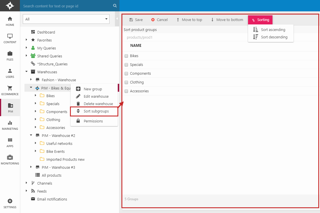 In contrast to product groups in Ecommerce, the warehouse group structure is only for administrative purposes, and can reflect anything you like without impacting how the products are published across channels. Name them after ERP codes, after manufacturers, or something else which makes sense for a particular project.