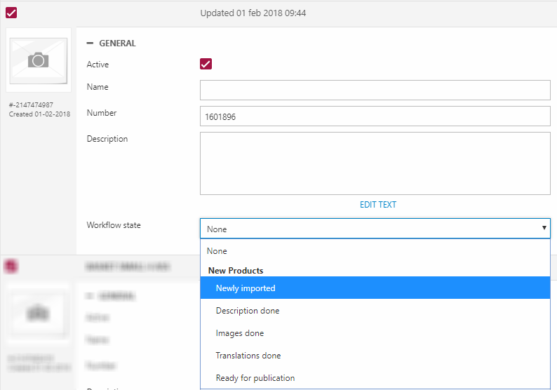- A number of states – e.g. New product, Ready for description, Ready for translation, etc.