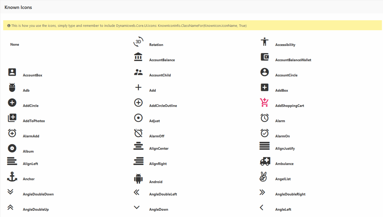 The List of all KnownIcons page contains a list of all the KnownIcons available when extending the Dynamicweb backend with custom functionality.