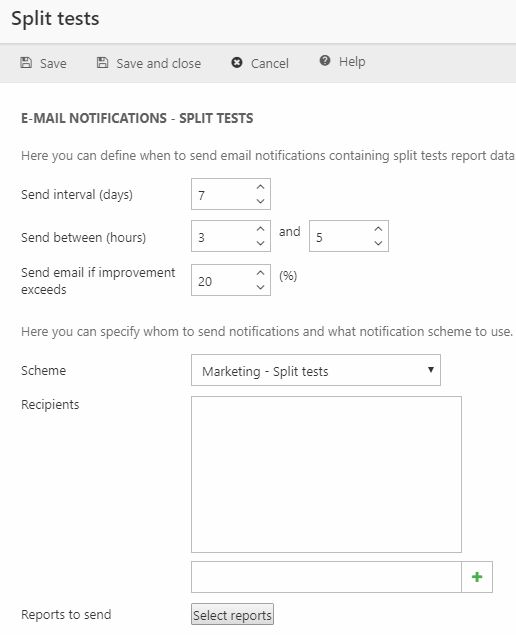 In the advanced settings here, you can set up email notifications for split tests (Figure 4.1). These emails will contain split test report data and will be sent in intervals if certain requirements are met.