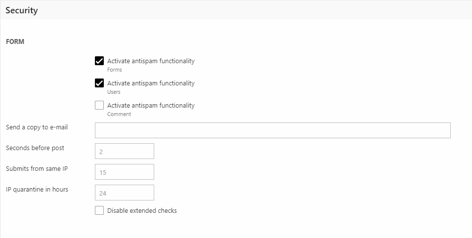 The Form settings allow you to activate and configure antispam on forms for editorsextranet forms, and comment forms (Figure 4.1).