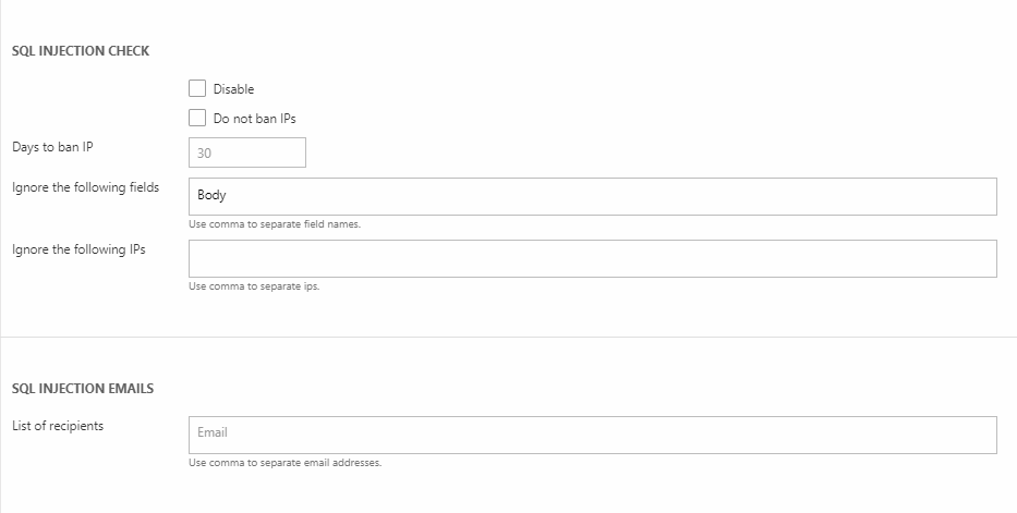 • Specify one or more emails to notify when an SQL injection attack is detected