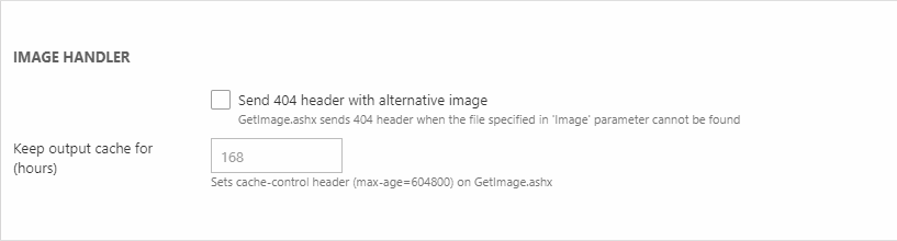 The Image Handler settings (Figure 7.3) control for how long the output cache from the Image Handler tool should be saved (in hours) . The default is 168 hours (one week).
