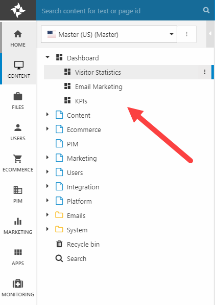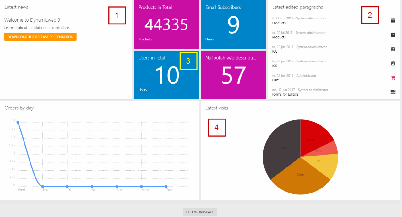 A dashboard provides an at-a-glance view of key data and statistics on a solution such as order data, the total number of visitors, or query counts from e.g. PIM or user management. The information is displayed on a workspace via widgets.