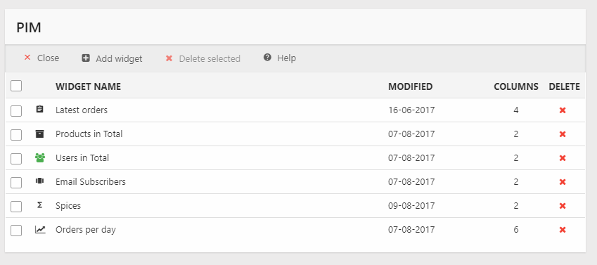 The workspace is divided into 12 columns, and the widget will be rendered according to their order on the widget list. Dynamicweb ships with a number of predefined widgets and widget types, some of which work out of the box, and others which must be configured before being useful.