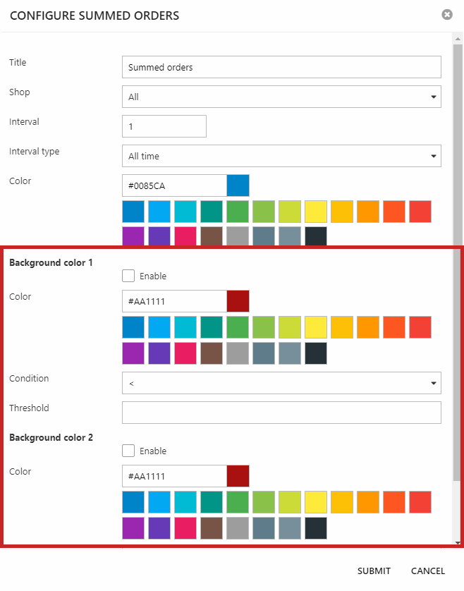 | Summed orders | Counter | Shows the sum of all orders on the solution within a certain timespan | Use parameters to set a timespan – e.g. 1 day, 1 week, or 1 month. |