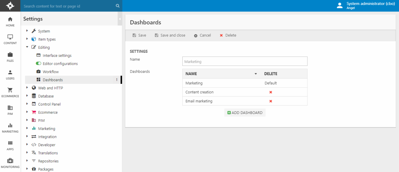 It is also possible to create additional workspaces for each area – these workspaces can also be customized. Both the default workspaces and the additional workspaces may be reset to the default layout. Additional workspaces are created from Settings > Dashboards under the area where the workspace should be listed (Figure 1.1).