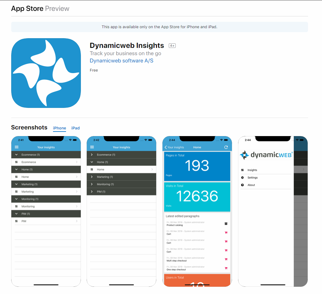 Dynamicweb Insights is a mobile app available for Apple and Android phones. It allows you to connect to a Dynamicweb solution and:
