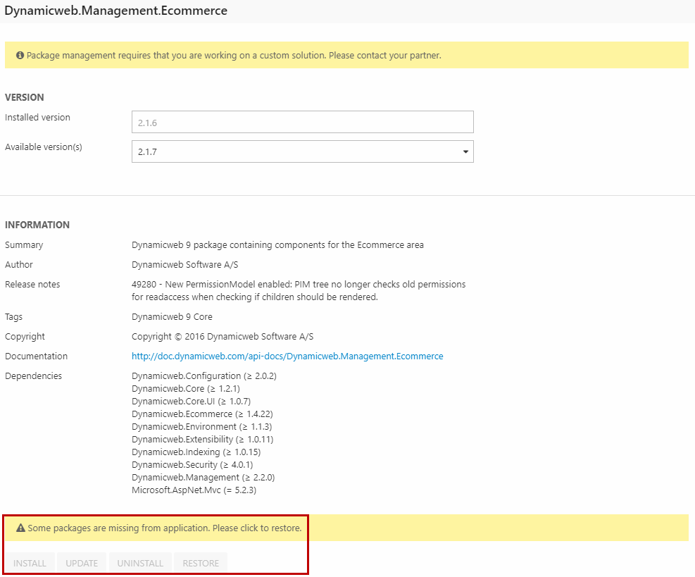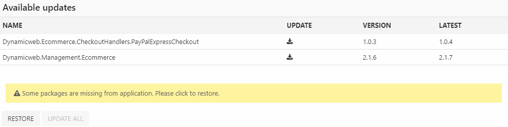 - If this is the first time you’re updating packages you will be informed that you need to restore missing packages first - click Restore to do so.