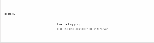The Debug section (Figure 3.1) allows you to enable logging – this logs tracking exceptions to the event viewer.