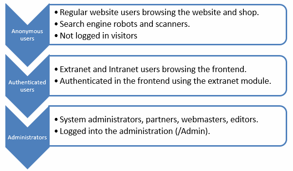 Anonymous and Authenticated users can only browse the frontend of the website (/Default.aspx) – they have access to everything not placed in /Admin and in /CustomModules subfolders with the exception of /Admin/Public folder.