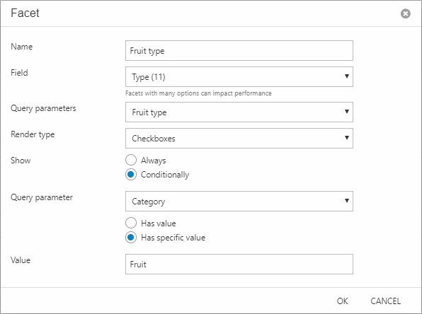 Obviously, you don’t want to show people interested in cars the fruit type facet – so you use the Show settings to specify that the Category parameter should have the value Fruit before showing the fruit type facet (Figure 5.1).