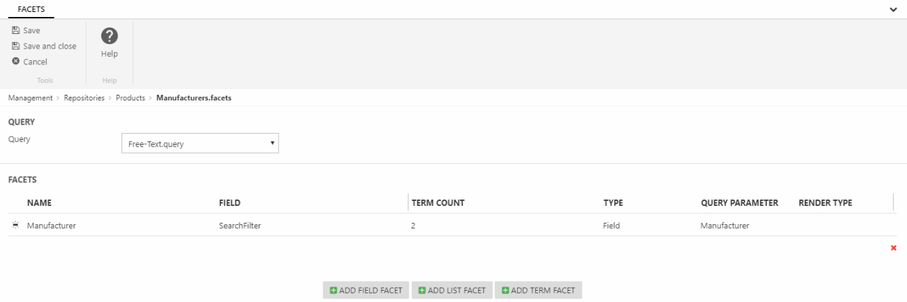 - Select a field to retrieve facet options from (fields with more than 2048 different terms cannot be selected - use a term facet instead)