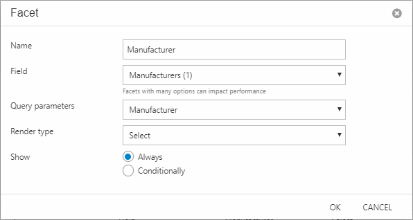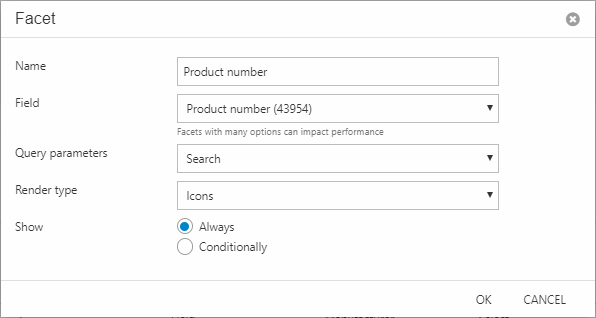 The Show section allows you to specify when the facet should be shown in frontend - Always or Conditionally, based on another facet/parameter having a value, specific or not.