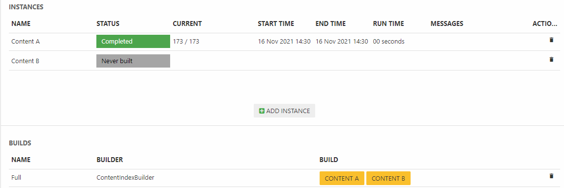 Once you’ve added instances, a build configuration, and a set of fields to the index you should build it – to do so click a yellow button with an instance name on it (Figure 5.1).