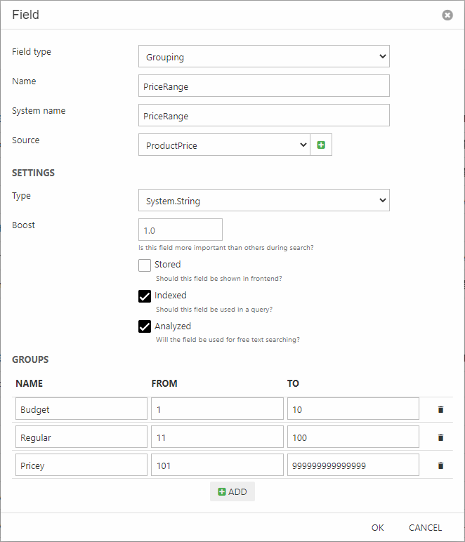- Set a boost value (how important this field is when ranking results)