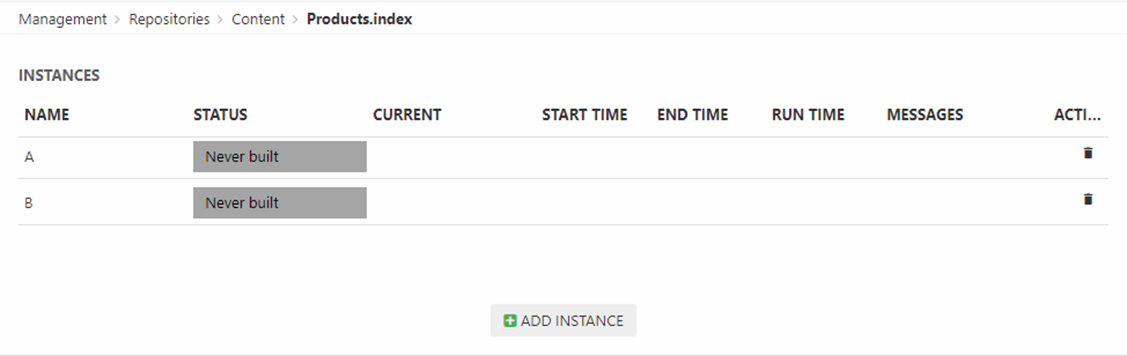 An instance is a file in the file archive – it is this file which is being searched when a query is executed. Since instances are often rebuilt to make sure they contain the most recent changes to product data you want to create at least 2 instances. This ensures that there’s always an instance to search, even if one instance is currently being rebuilt.