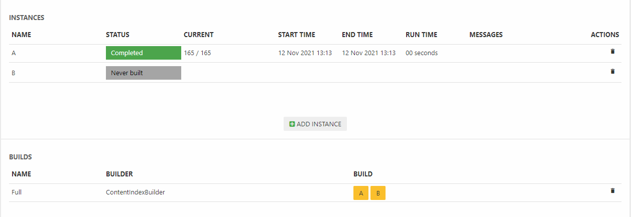 Once you’ve added instances, a build configuration, and a set of fields to the index you should build it – to do so click a yellow button with an instance name on it (Figure 5.1).