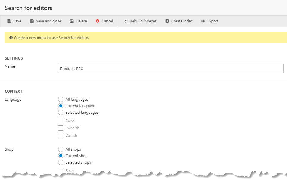 - You define a context – the languages and shops you want to create a search configuration for