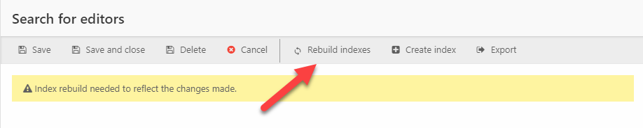 Whenever you make a change to the fields section, you will be asked to rebuild the index. This is done by clicking the Rebuild indexes button in the toolbar ({figureref]).