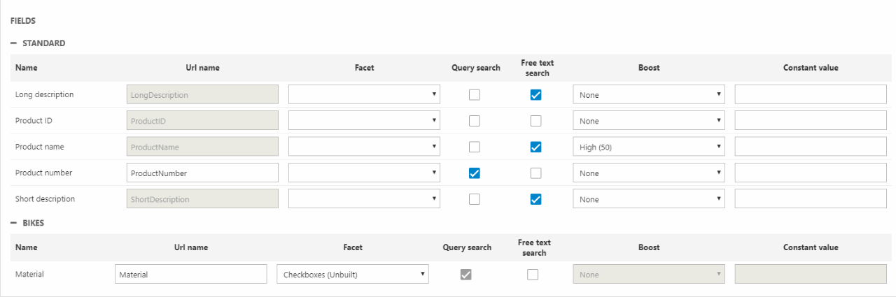 When you create a Search for Editors configuration you generally want to create a free text search and a set of facets appropriate to the product portfolio – color, size & brand for apparel, or frame material, brand, and drivetrain for bicycle frames, etc.