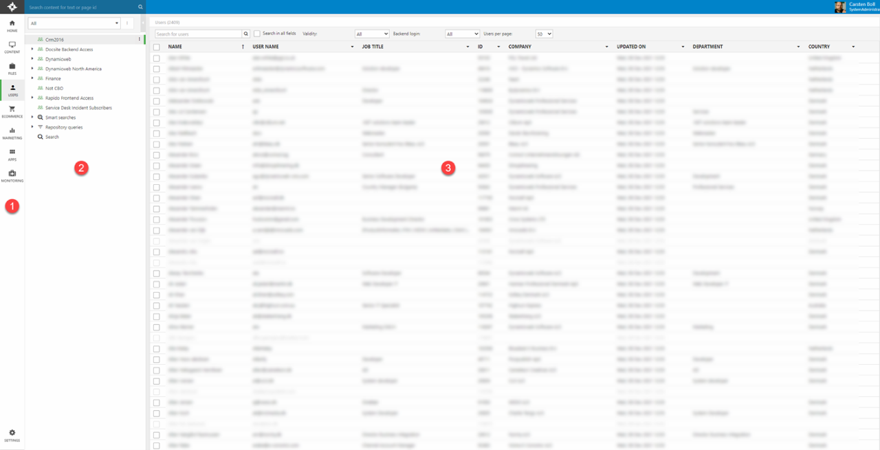 Like other areas of Dynamicweb, this area is accessed via the area menu (1) and consists of a tree (2) where you select a user group or feature to work with, and a content pane (3) where you view and work with the data (Figure 1.1).