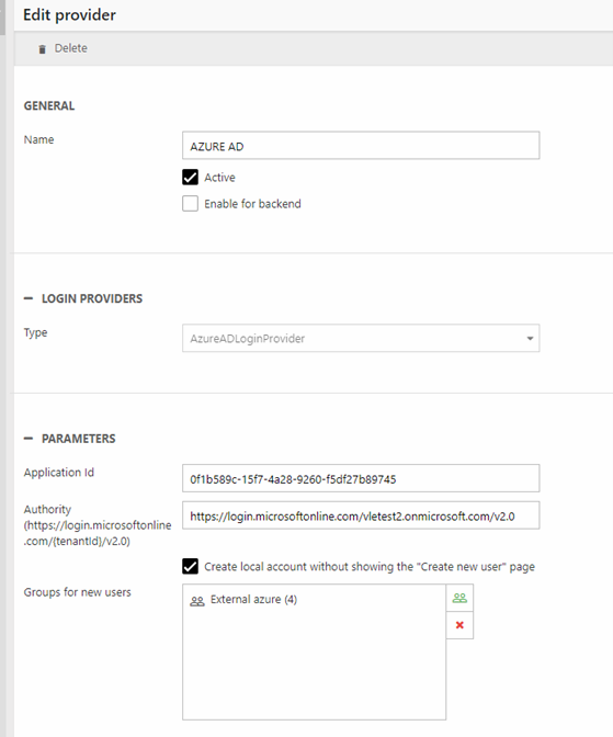 This guide will explain how to set up an external login provider connecting to Azure Active Directory (Azure AD) so that it becomes possible for users to login to backend and frontend with Azure AD accounts including Office 365 accounts.