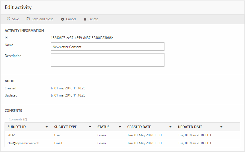 Please note, that a user gives consent to a particular activity as it is worded at the time of consent. If you edit the name or the description of an activity afterwards, their consents are no longer valid.