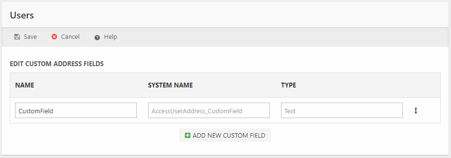 This opens the custom address fields view (Figure 2.2) from where you can add new custom fields and specify a name, a system name, and a field type.