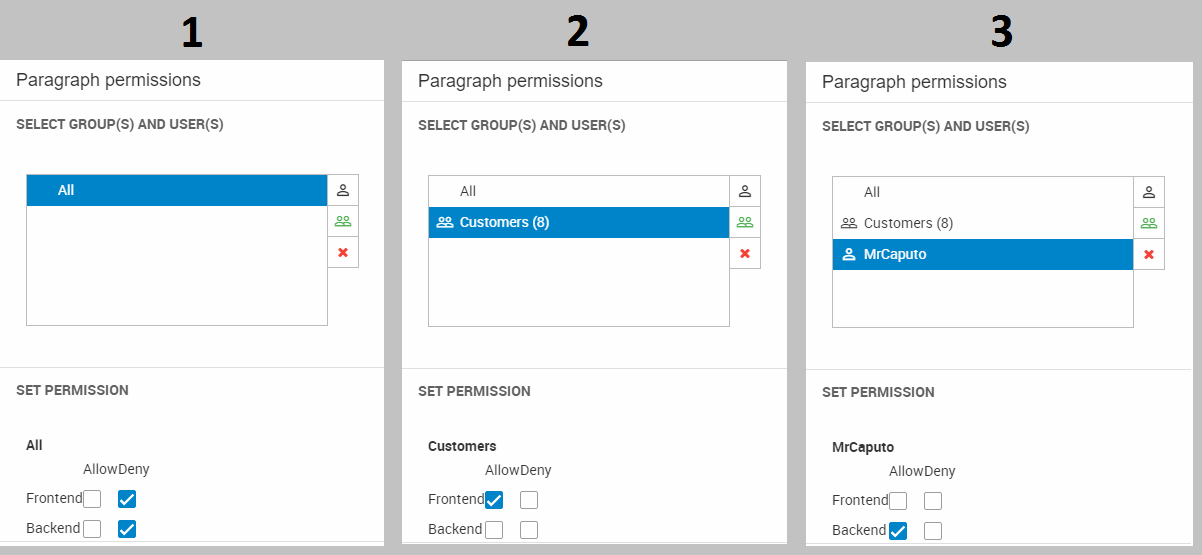 As you can see, you can Allow or deny frontend and backend access to the paragraph, for users in the all group, by checking the appropriate checkboxes.