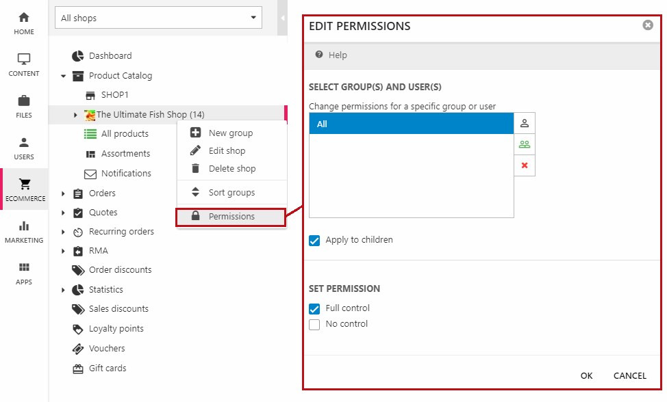 Ecommerce permissions apply only to backend users and may be set for:
